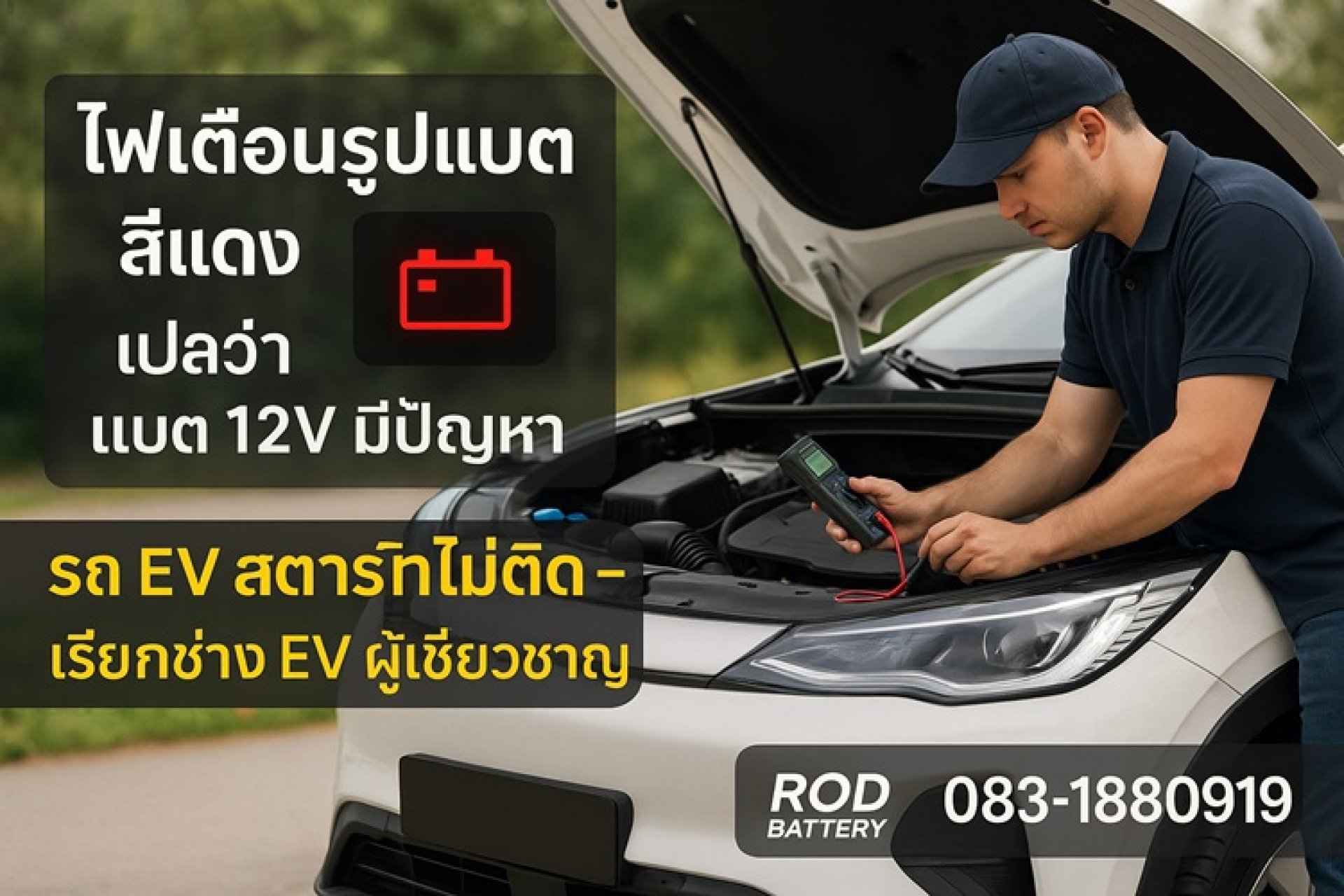 แบตเตอรี่ 12V ของรถ EV มีปัญหา (ไฟต่ำ / เสื่อม / วัดค่าไม่เสถียร) สัญลักษณ์ รูปแบตเตอรี่สีแดง